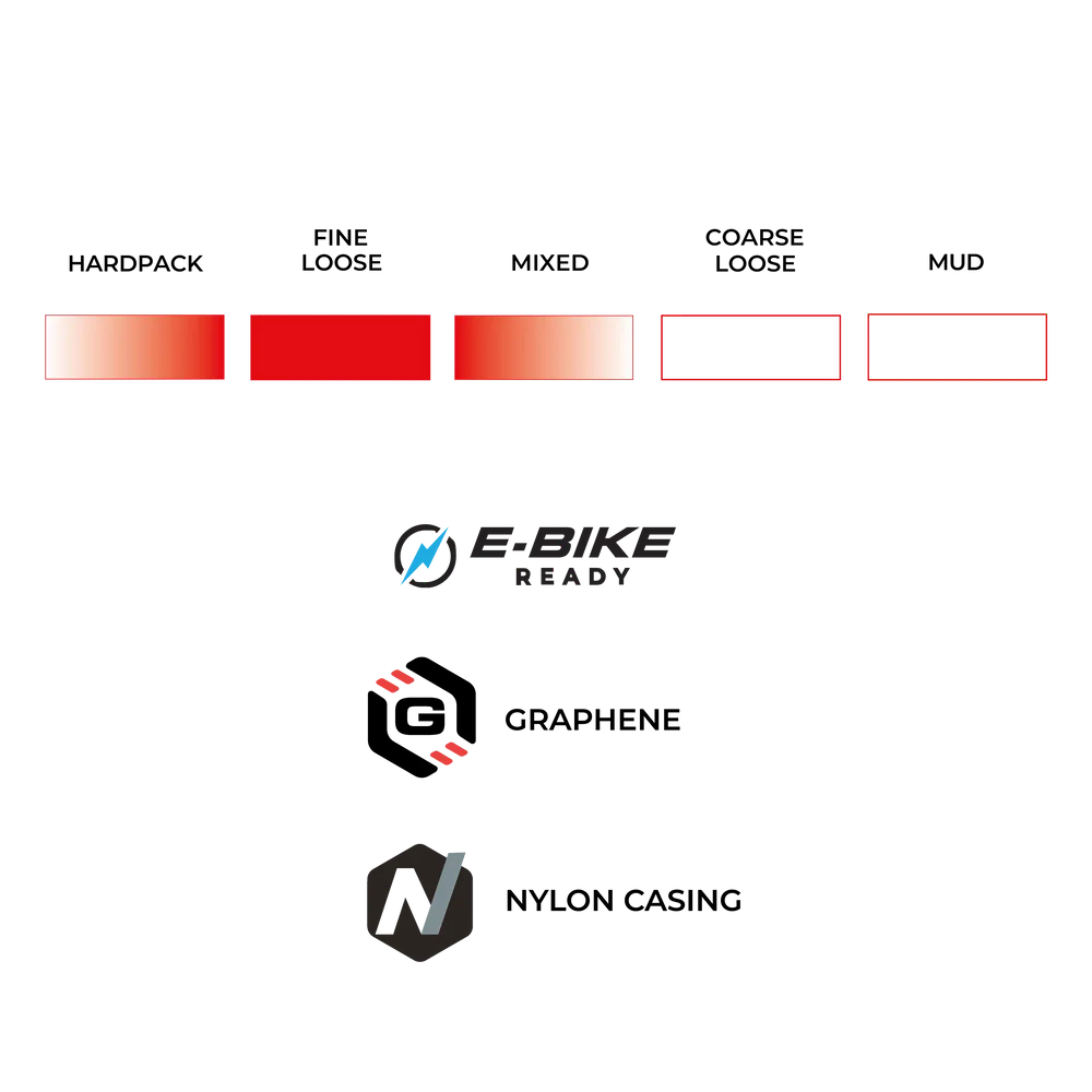 The Terreno T30 Fine Loose Gravel Endurance tire strikes the perfect balance between speed and control on fast-rolling gravel. The T30 features a unique fish scale center strip and is optimized for low rolling resistance while maintaining braking traction and stability in demanding conditions. The siped shoulder knobs are engineered to dig into off-camber sections, offering enhanced grip when cornering, while a gradual ramp-up tread design ensures a smooth, confident transition as you lean into turns. All made from our Endurance Formulation powered by Graphene.