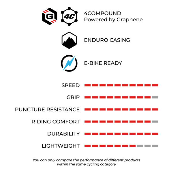 With Mostro Enduro, you can experience enhanced anchor-like braking-stability and control through the pronounced trailing edges. Thanks to the progressively siped and surface-stepped tread profile, you can hold the line across rocks, roots, and loose surfaces. The Enduro version uses the 4Compound technology featuring 4 optimized rubber compounds for increased durability.