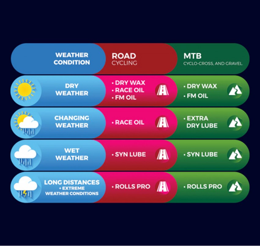 Professional bicycle lubricant based on wax, added with selected additives, which form a thin, flexible lubricating coating. Once applied, the liquid penetrates into the inner side of the chain. The wax leaves a lubricating coating which repels dirt. The product can be used for MTB and race applications.