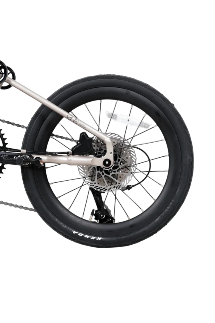 Utilizing an Aluminium body and redesigned frame to fit this purpose, they are unlike any of Brompton's clones that you see on the market. The rear triangle now pivots around the crank base as compared to the clones, which pivot using a thin rod. Due to aluminium's unique structure, the stress point of the bike has to be redesigned to stay durable and functional after prolonged usage. The redesigned body also ensures that folding is not compromised, unlike many Brompton clones, which require additional tensioners when using road bike derailleurs.